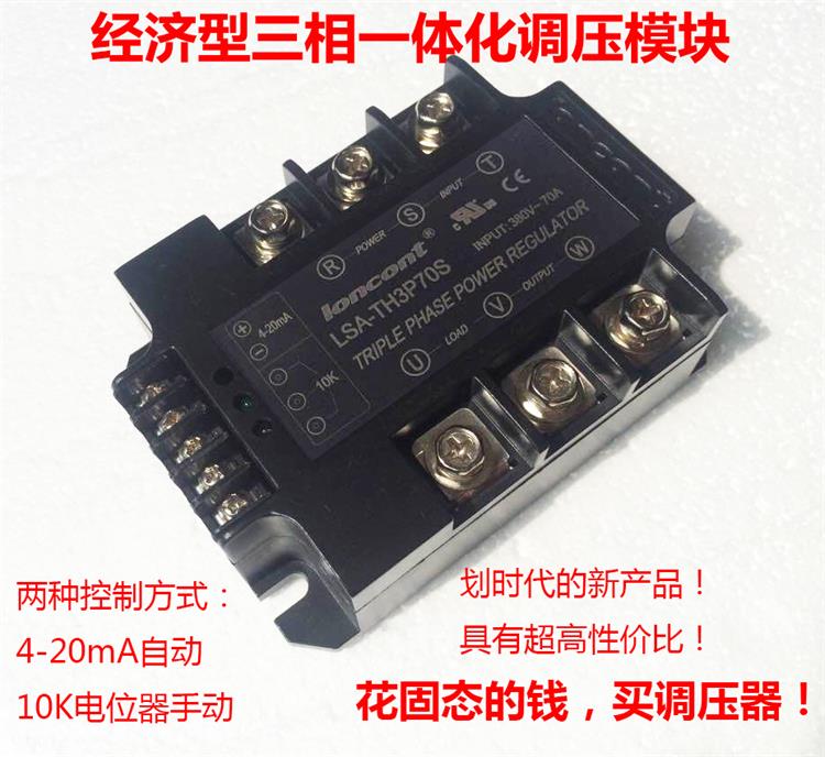 1、龍科LSA-系列經(jīng)濟(jì)型三相調(diào)壓模塊采用進(jìn)口大規(guī)模集成電路設(shè)計,內(nèi)部集三相移相觸發(fā)電路、單向可控硅、RC阻容吸收回路及電源電路等于一體,在4-20mA輸入控制或者10K電位器作用下,產(chǎn)生三相可改變導(dǎo)通角的強(qiáng)觸發(fā)脈沖信號再去分別控制內(nèi)部可控硅,實現(xiàn)三相負(fù)載電壓從0V到電網(wǎng)全電壓的無級可調(diào)。