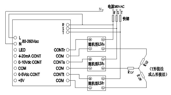 觸發(fā)器TSRG可以驅(qū)動從幾十安到數(shù)百安的全系列規(guī)格的隨機(jī)型固態(tài)繼電器,組成簡單經(jīng)濟(jì)的三相調(diào)壓系統(tǒng),此方案一般用于大功率調(diào)壓系統(tǒng)。對于150A規(guī)格以下場合,可選用三相一體化調(diào)壓模塊。