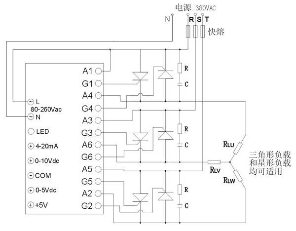 4、觸發(fā)器可以驅(qū)動(dòng)從幾十安到千余安的全系列規(guī)格的單相可控硅,組成簡(jiǎn)單經(jīng)濟(jì)的三相調(diào)壓系統(tǒng),此方案一般用于大于