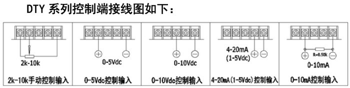 獨(dú)特的全兼容輸入控制模式,使產(chǎn)品對(duì)0-5Vdc、0-10Vdc、4-20mA、0-10mA等自動(dòng)方式均能適應(yīng),無須專門特別訂制,也可用電位器手動(dòng)控制。注意LSA系列和DTY系列接線方式的區(qū)別,請(qǐng)勿混淆。