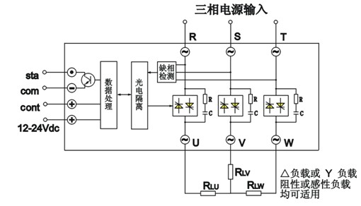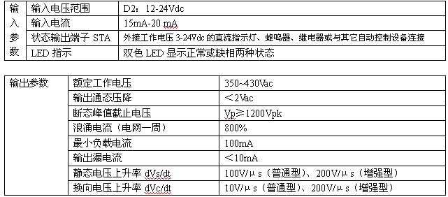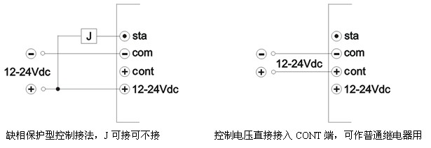 當(dāng)三相電源發(fā)生缺相(缺一相或二相)或斷相,繼電器會(huì)迅速切斷輸出,關(guān)閉工作,進(jìn)入自鎖狀態(tài),直至切斷輸入控制電源,重新加控制電。繼電器內(nèi)置狀態(tài)(STA)輸出端子,為集電極開路式,可外接工作電壓3-24Vdc的直流指示燈、蜂鳴器、繼電器,或與其它自動(dòng)控制設(shè)備連接,作報(bào)警提示。若將控制電壓直接輸入CONT端,則也可作普通三相交流固態(tài)繼電器使用。