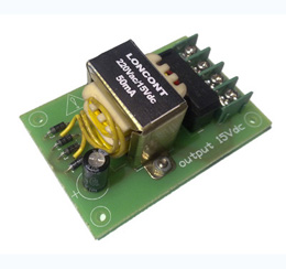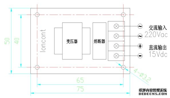 本電源由15V變壓器、1A熔斷器、接線(xiàn)端子、及整流濾波電路的組成,輸入220V交流,輸出15V直流,輸出電流約50mA。外形尺寸:長(zhǎng)75*寬50*高35 mm 。如下圖: